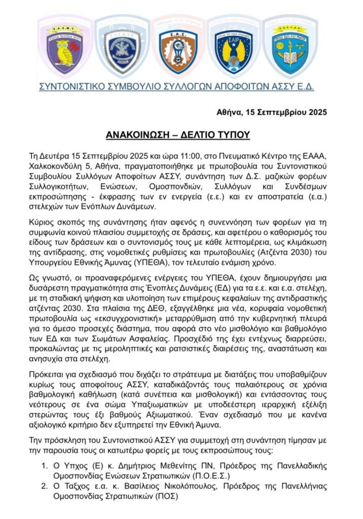 Η Ομοσπονδία τονίζει ότι οι επιπτώσεις των νομοθετικών ρυθμίσεων δεν θα περιοριστούν μόνο στα στελέχη που προέρχονται από τις Σχολές Υπαξιωματικών, αλλά θα επηρεάσουν το σύνολο του στρατιωτικού προσωπικού, καθώς και αποφοίτους ΑΣΕΙ.