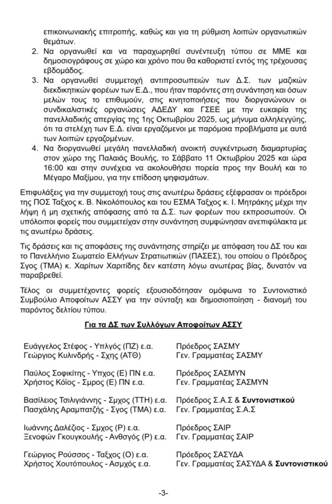- Όλους τους στρατιωτικούς να δώσουν το «παρών» στη συγκέντρωση διαμαρτυρίας, φορώντας τη στολή τους για να υπογραμμιστεί η μαζικότητα της κινητοποίησης.